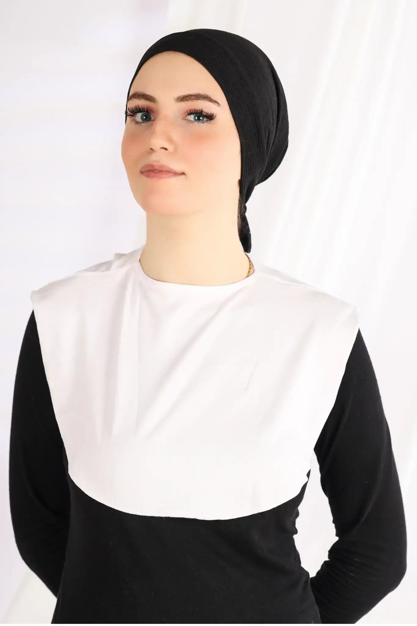 The round neck-cover made from 95% soft cotton material and 5% Lycra, a non-revealing piece, covers the chest and the shoulder area and has a rounded cut for easy use. Available in multiple colors.